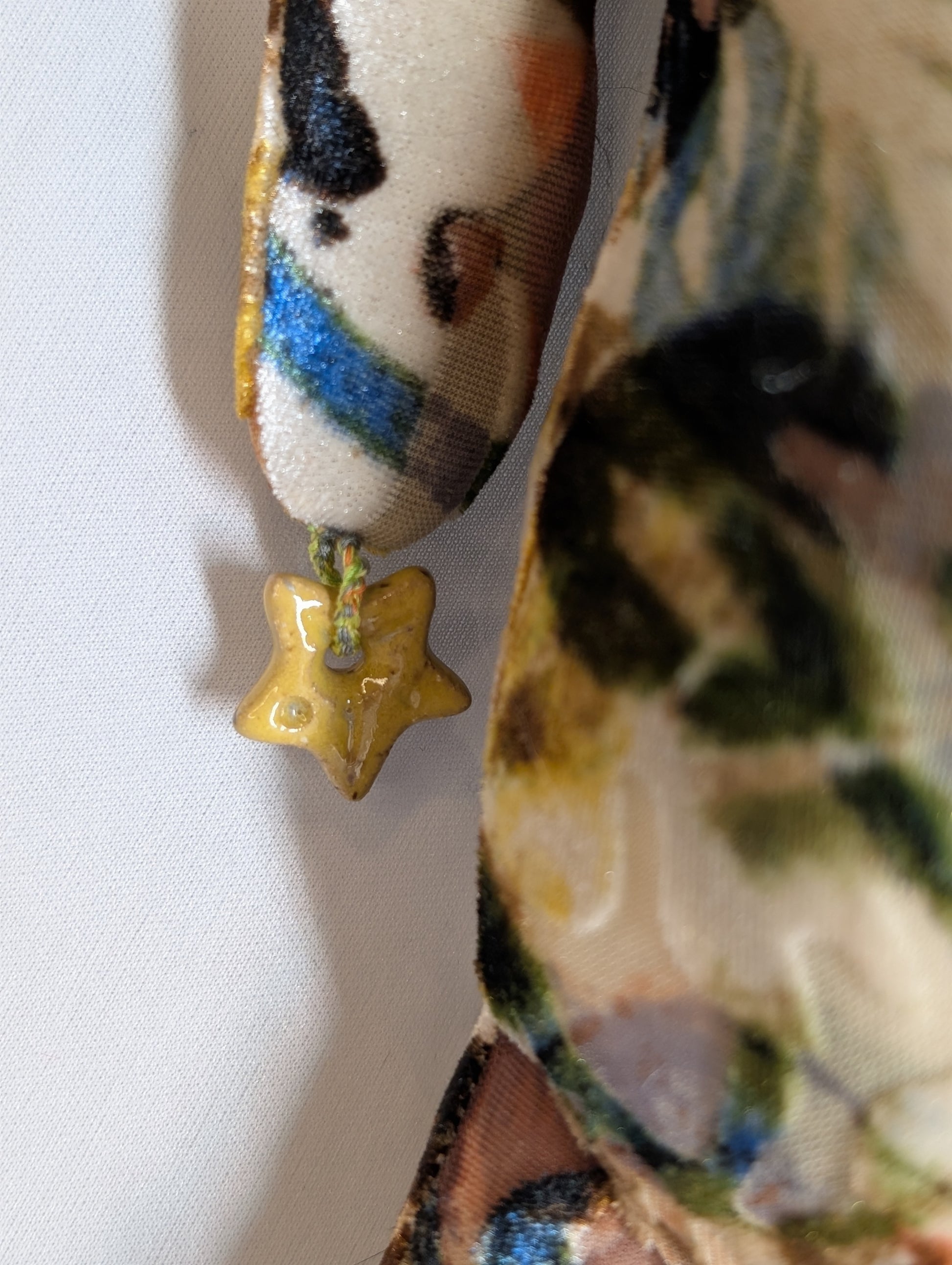 Astrido, "Beloved." Holding divine strength and sharing with those who need it. Approximately 17" tall, with soft body, a hanging loop behind the head, and a hand-sculpted, hand-carved ceramic face.