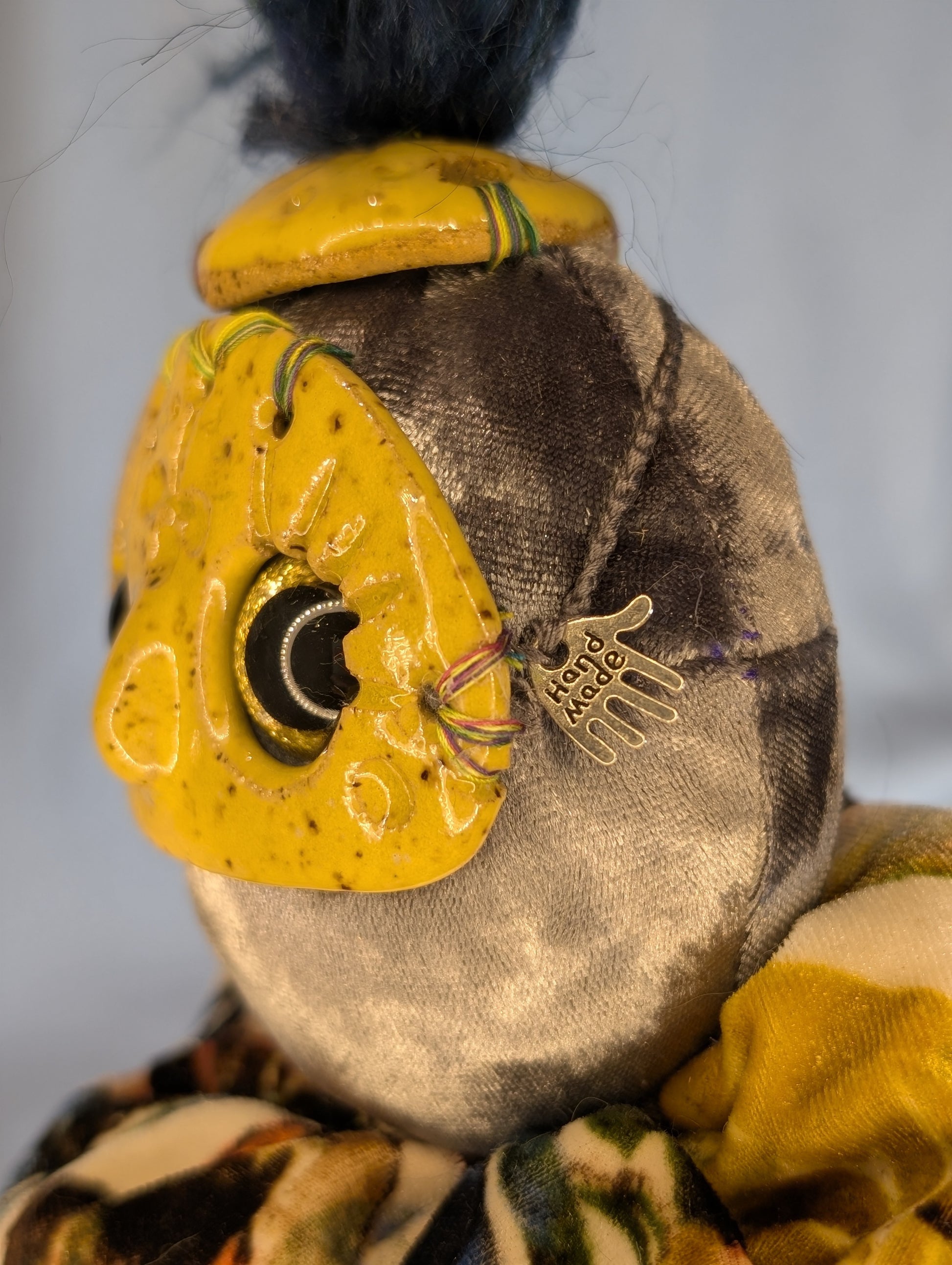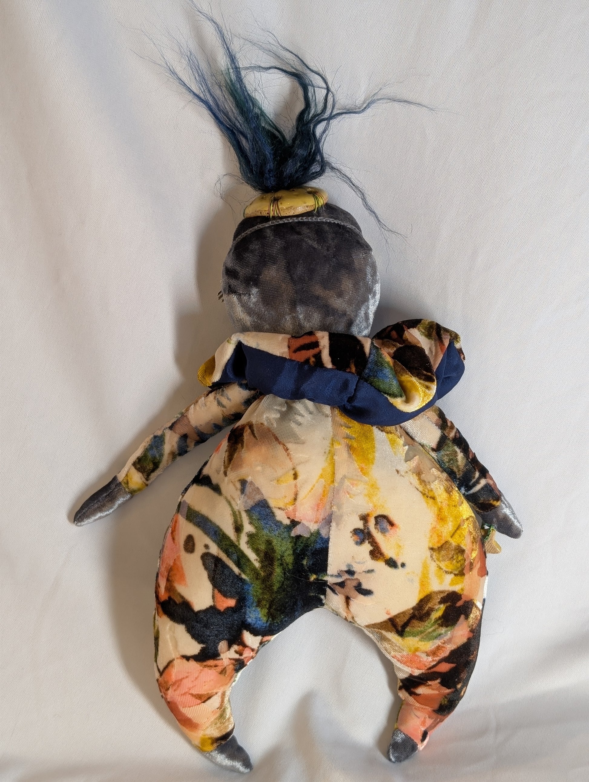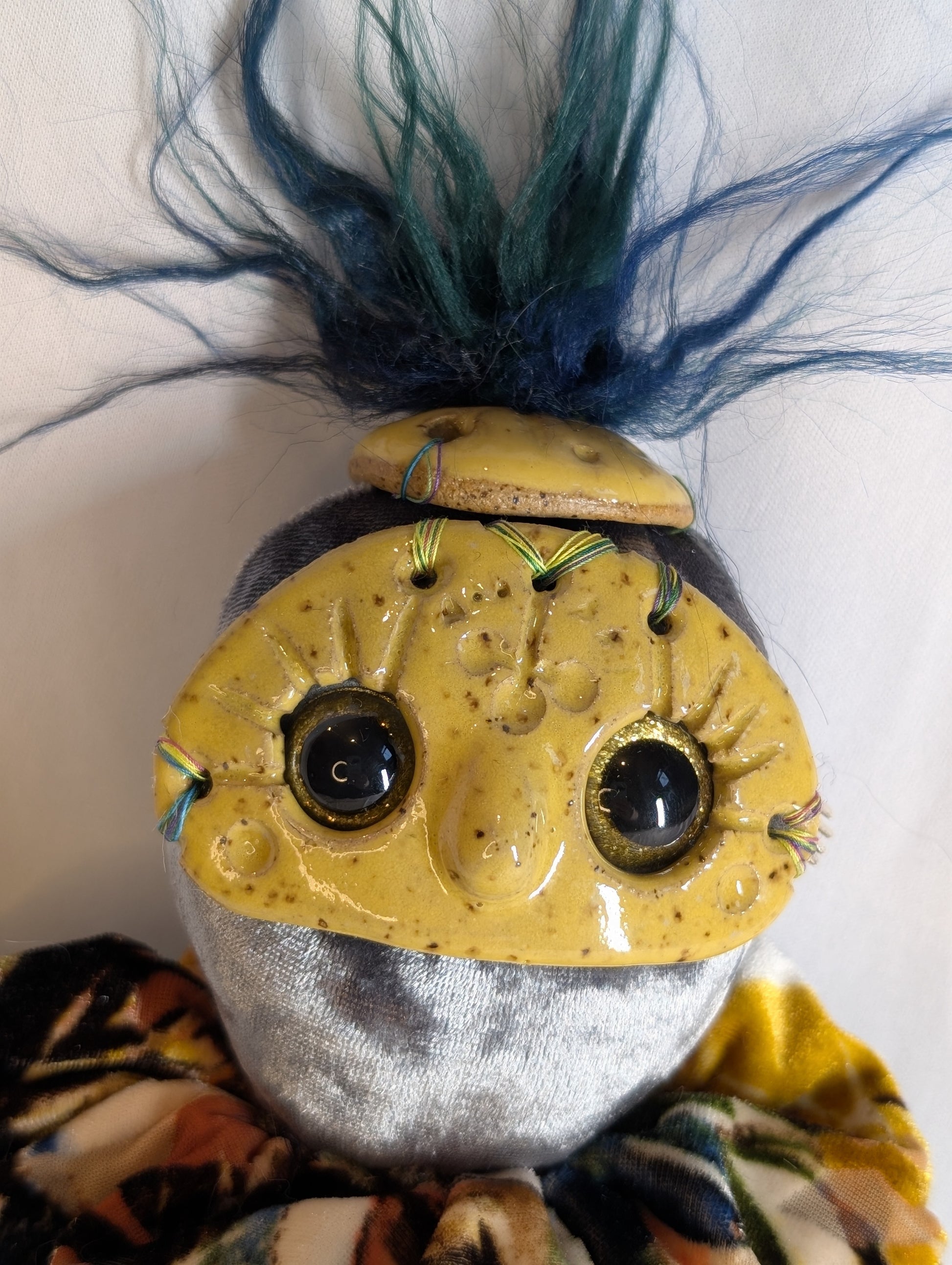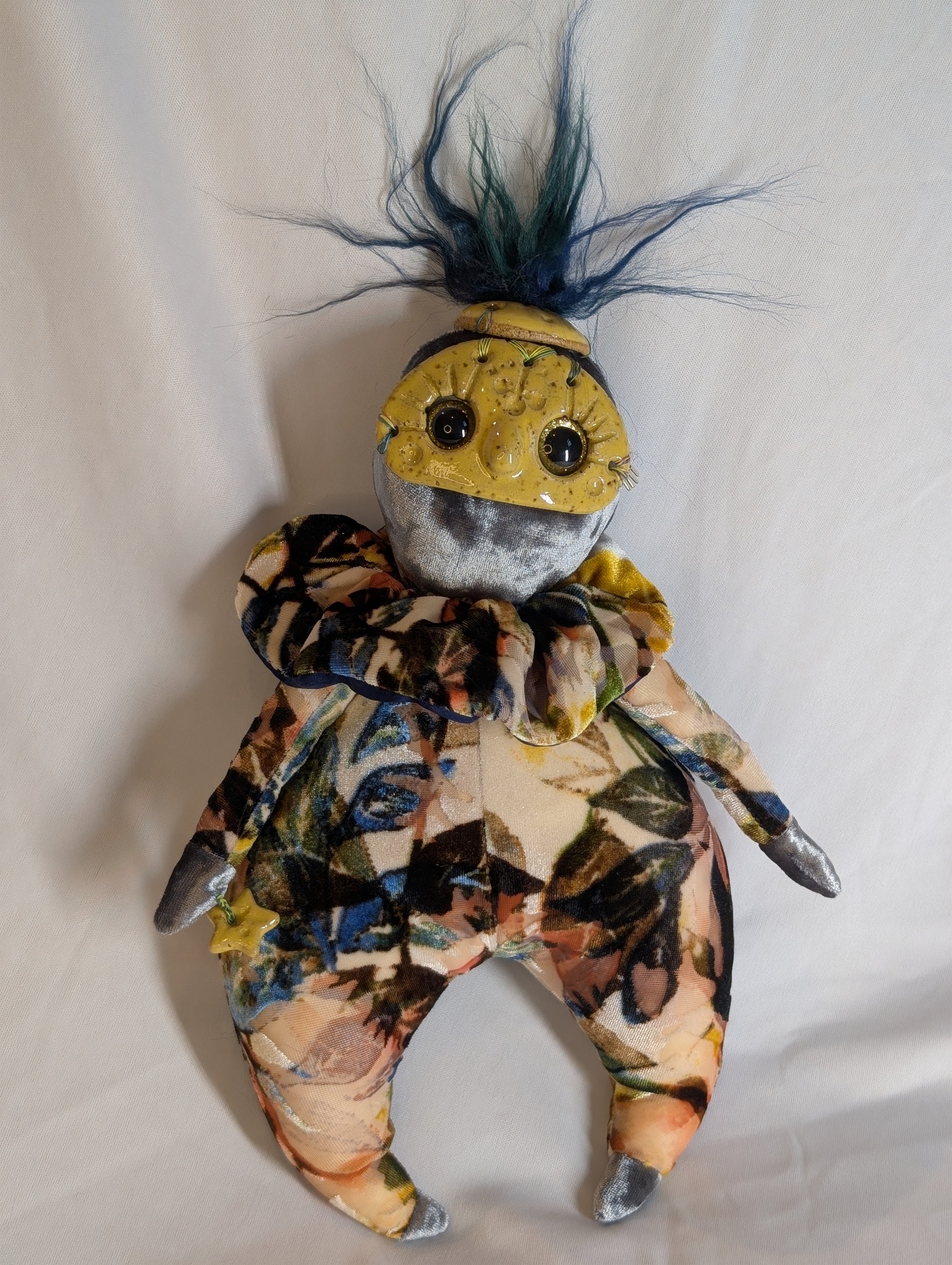 Lyra, "Harmony." Loves dancing and bouncing around to all kinds of music! Approximately 14" tall, with soft body, a hanging loop behind the head, and a hand-sculpted, hand-carved ceramic face.