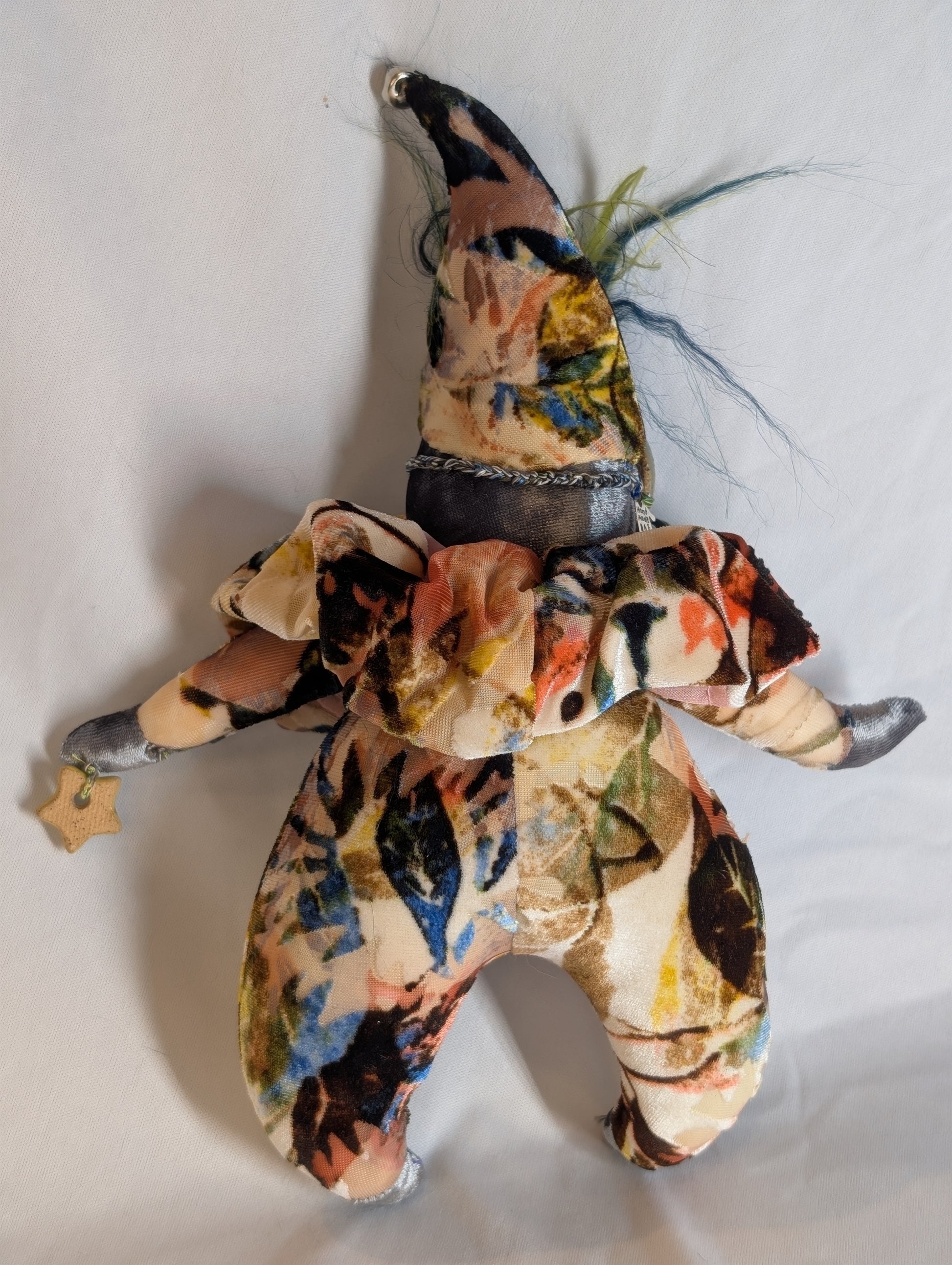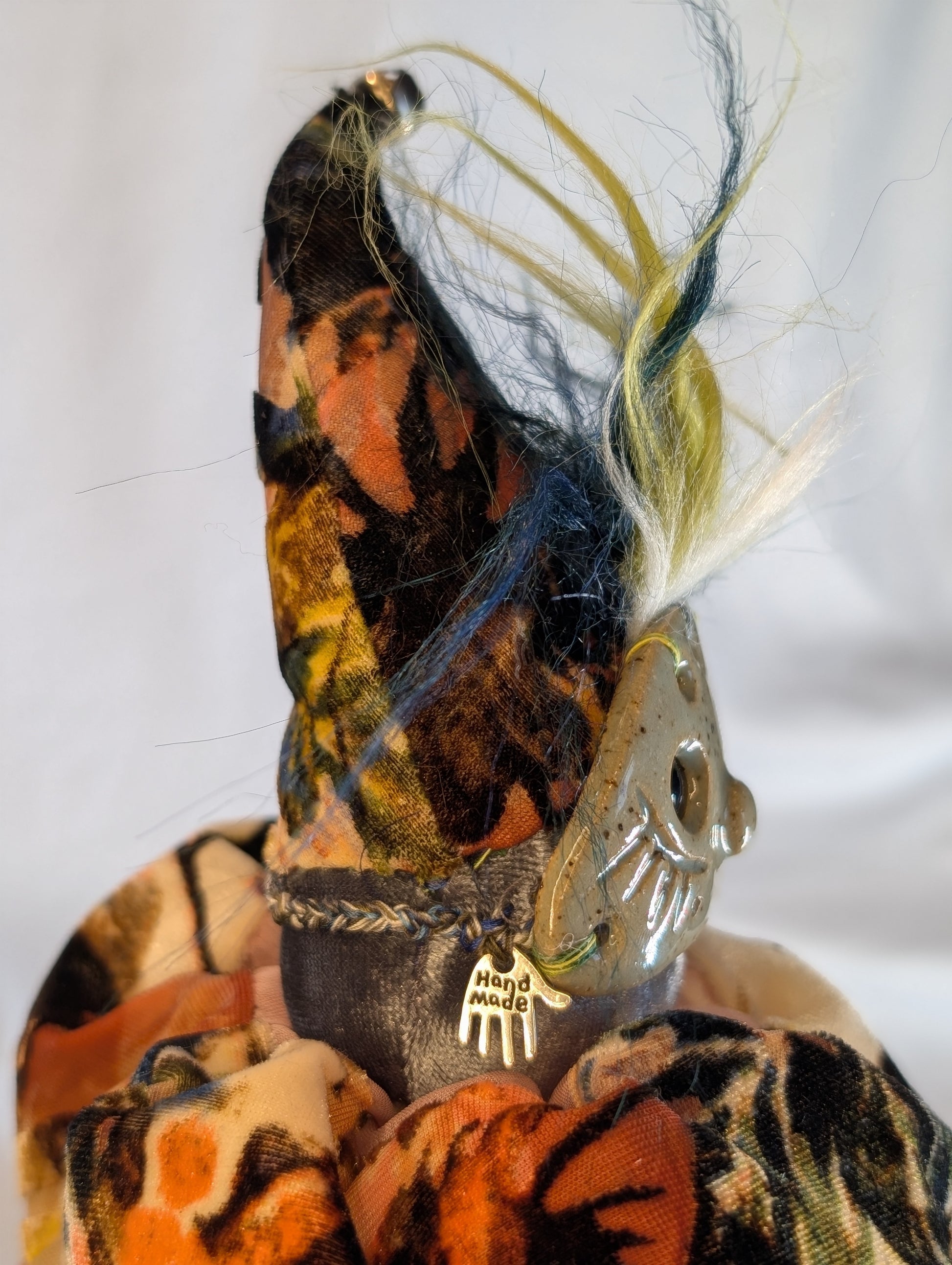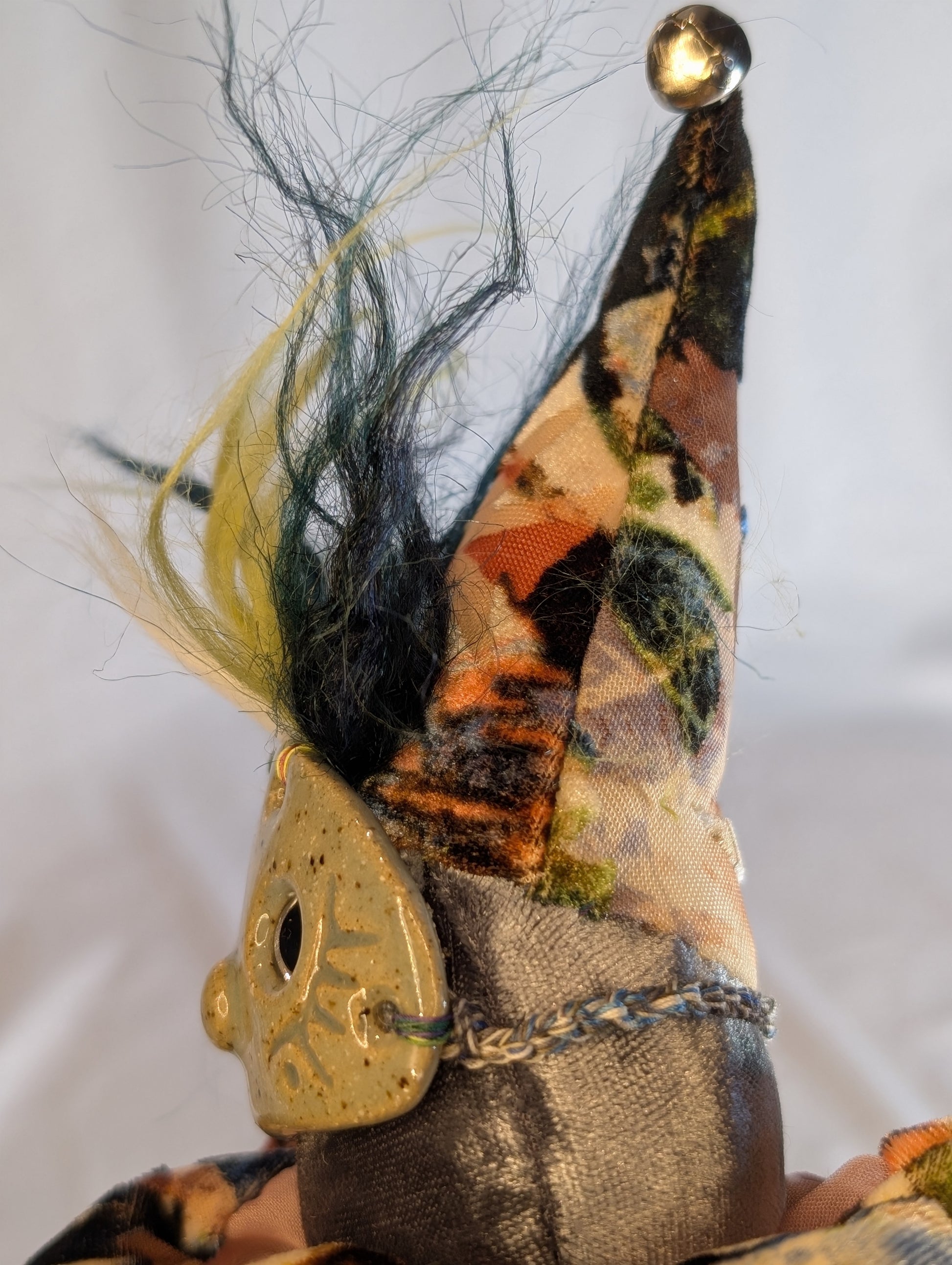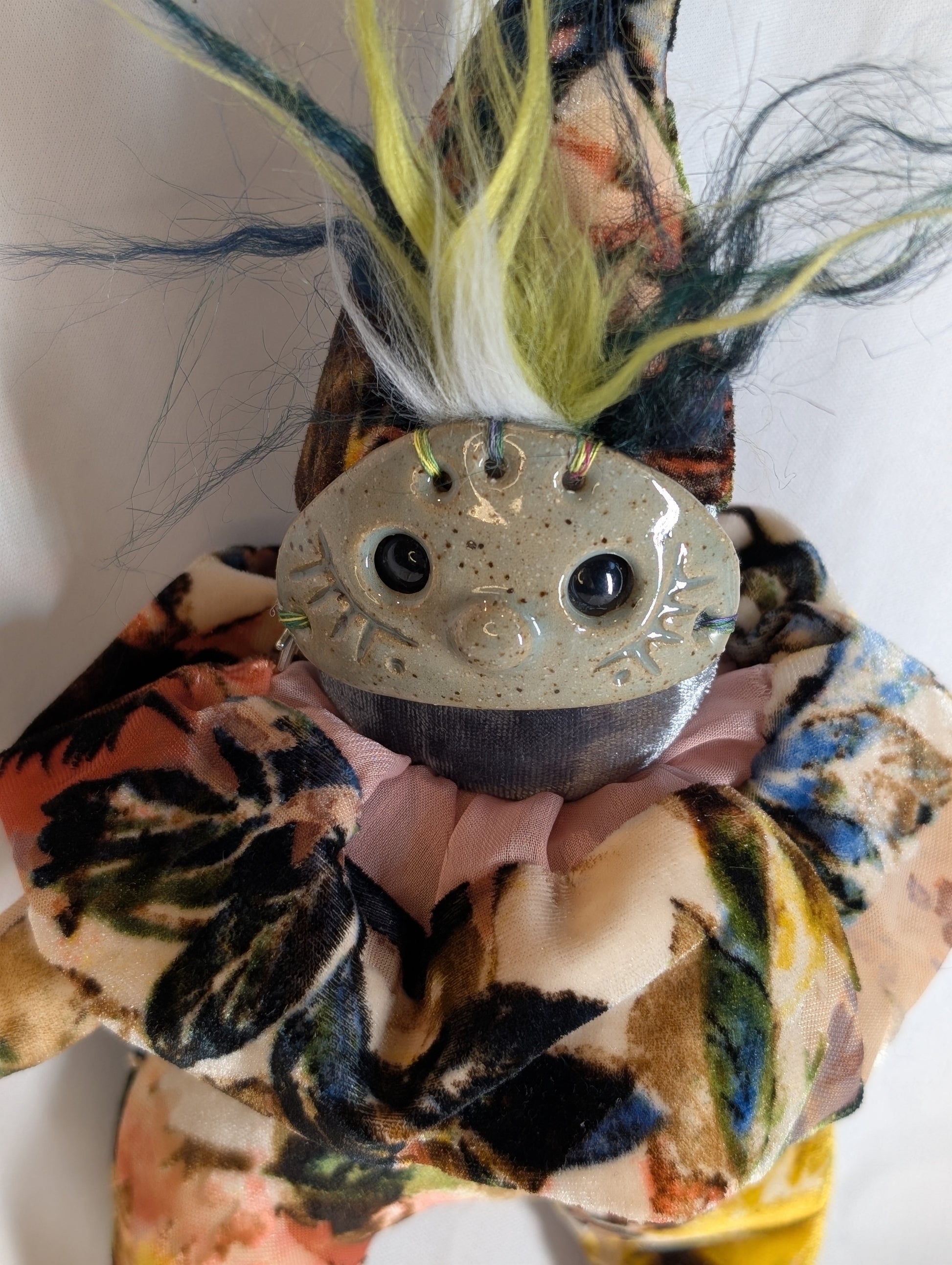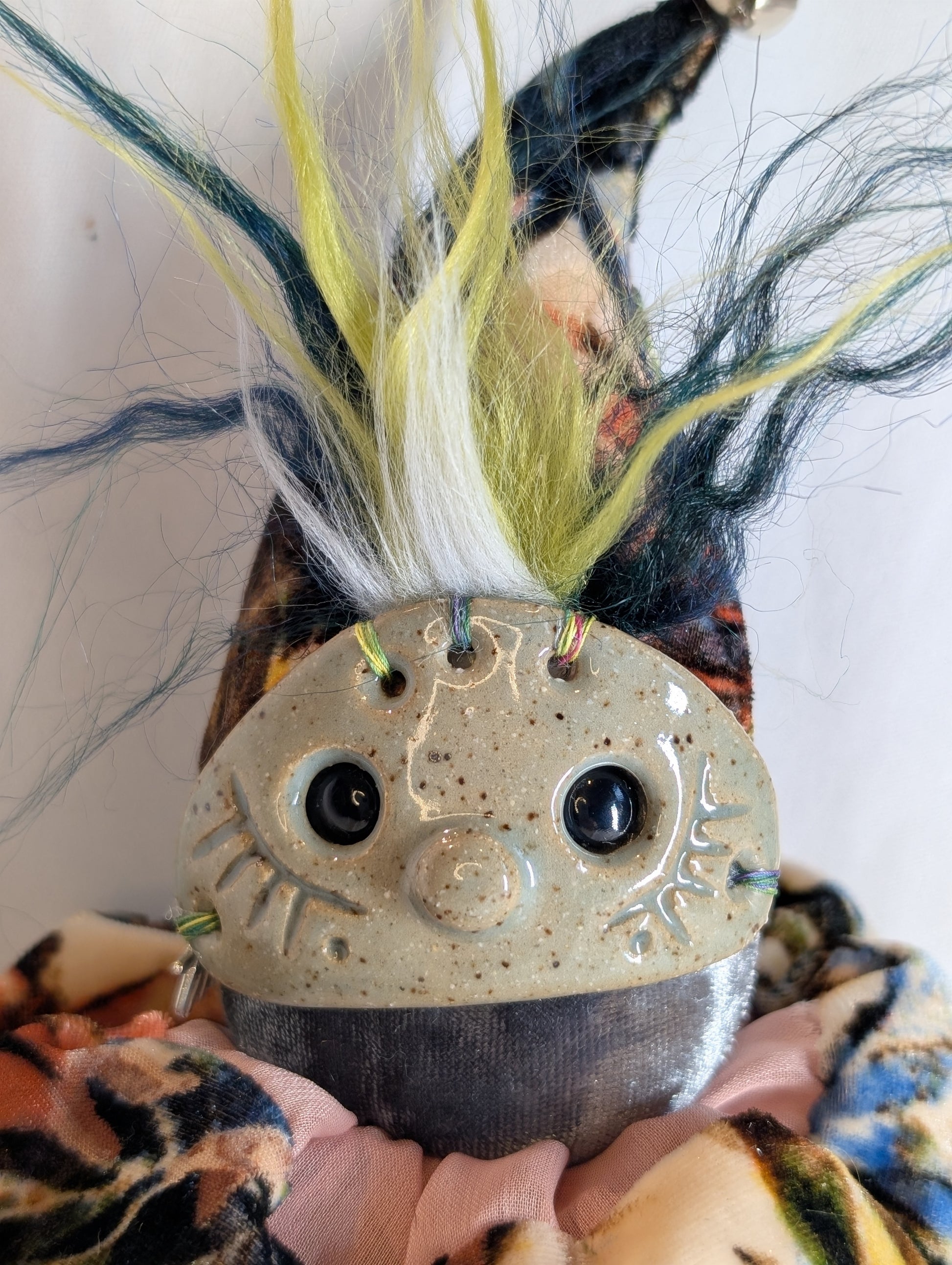 Papagena, "Tiny Hunter." Likes to chase birds & stars, better at catching stars! Approximately 11" tall, with soft body, a hanging loop behind the head, and a hand-sculpted, hand-carved ceramic face.