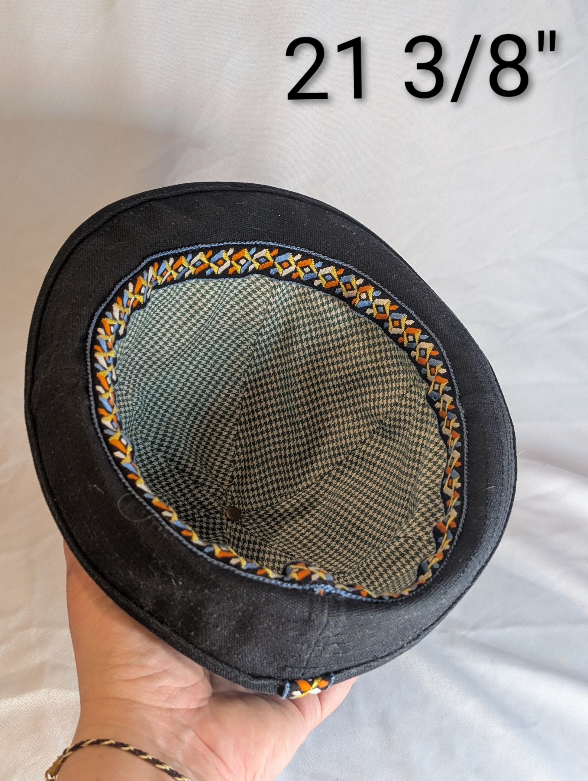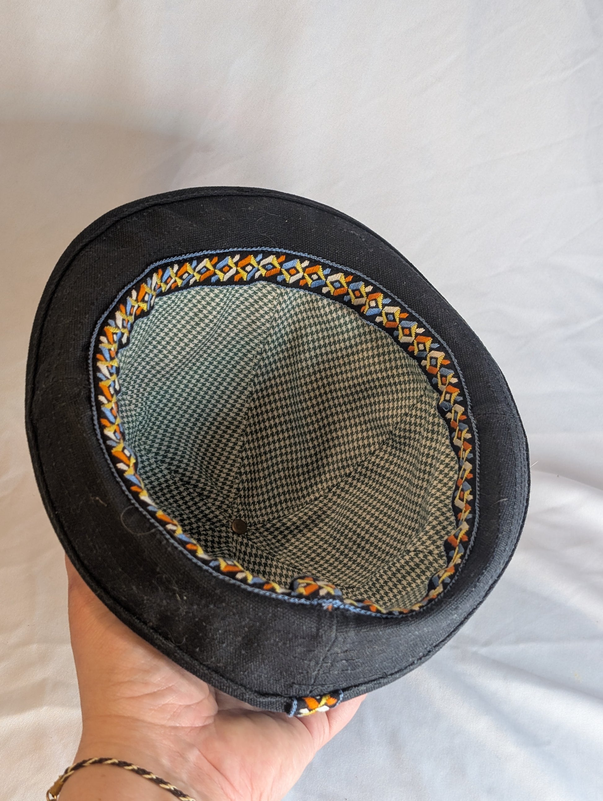 Meet The Angler, a hat inspired by a 1920's woman's fishing hat featured in the Sporting Fashion: Outdoor Girls from 1800-1960 exhibit, which we got to see at the Frick Museum in 2021 and it blew our minds all the way out the door. I had to make this hat just to get my brain back together. The crown of the hat has a bit more shaping than the 1920's original, and the back brim can be worn flipped up or down. It's fully lined with a vintage cotton print. Wear in good health. ~Lauren