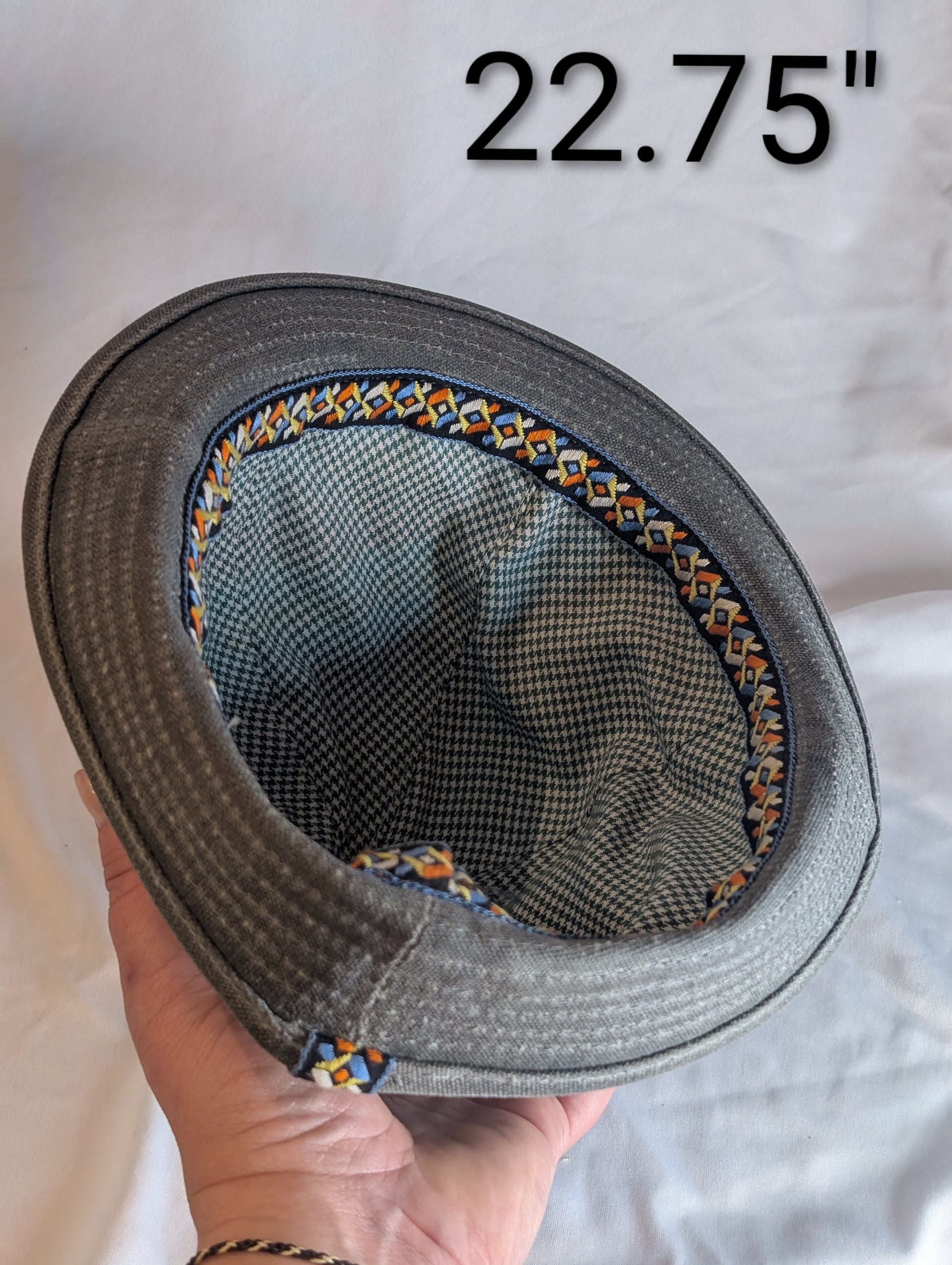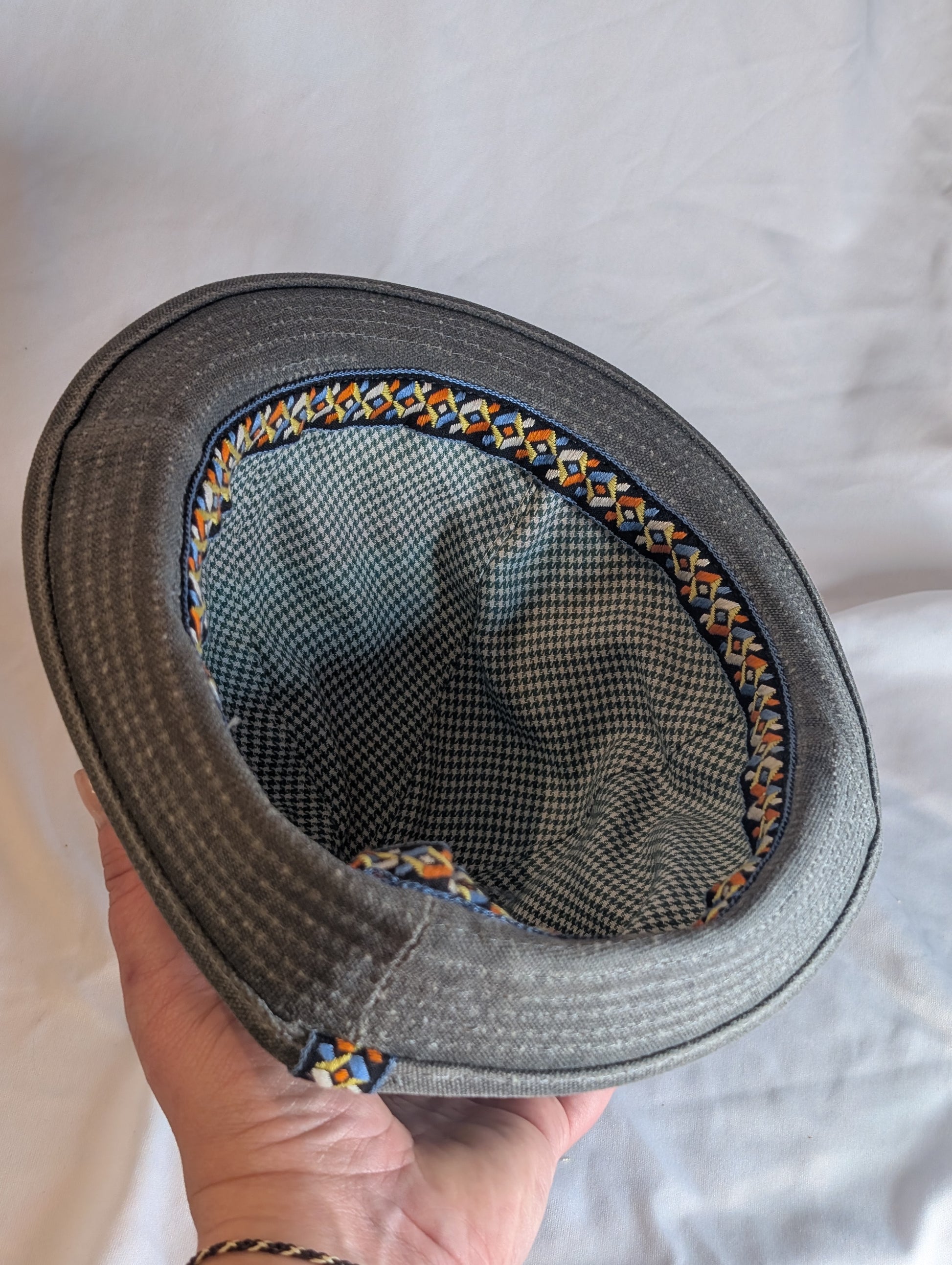 Meet The Angler, a hat inspired by a 1920's woman's fishing hat featured in the Sporting Fashion: Outdoor Girls from 1800-1960 exhibit, which we got to see at the Frick Museum in 2021 and it blew our minds all the way out the door. I had to make this hat just to get my brain back together. The crown of the hat has a bit more shaping than the 1920's original, and the back brim can be worn flipped up or down. It's fully lined with a vintage cotton print. Wear in good health. ~Lauren